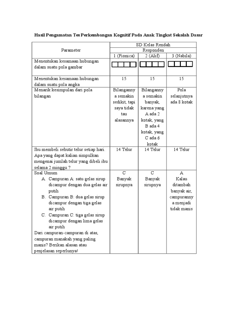 Hasil Pengamatan Tes Perkembangan Kognitif Pada Anak Tingkat